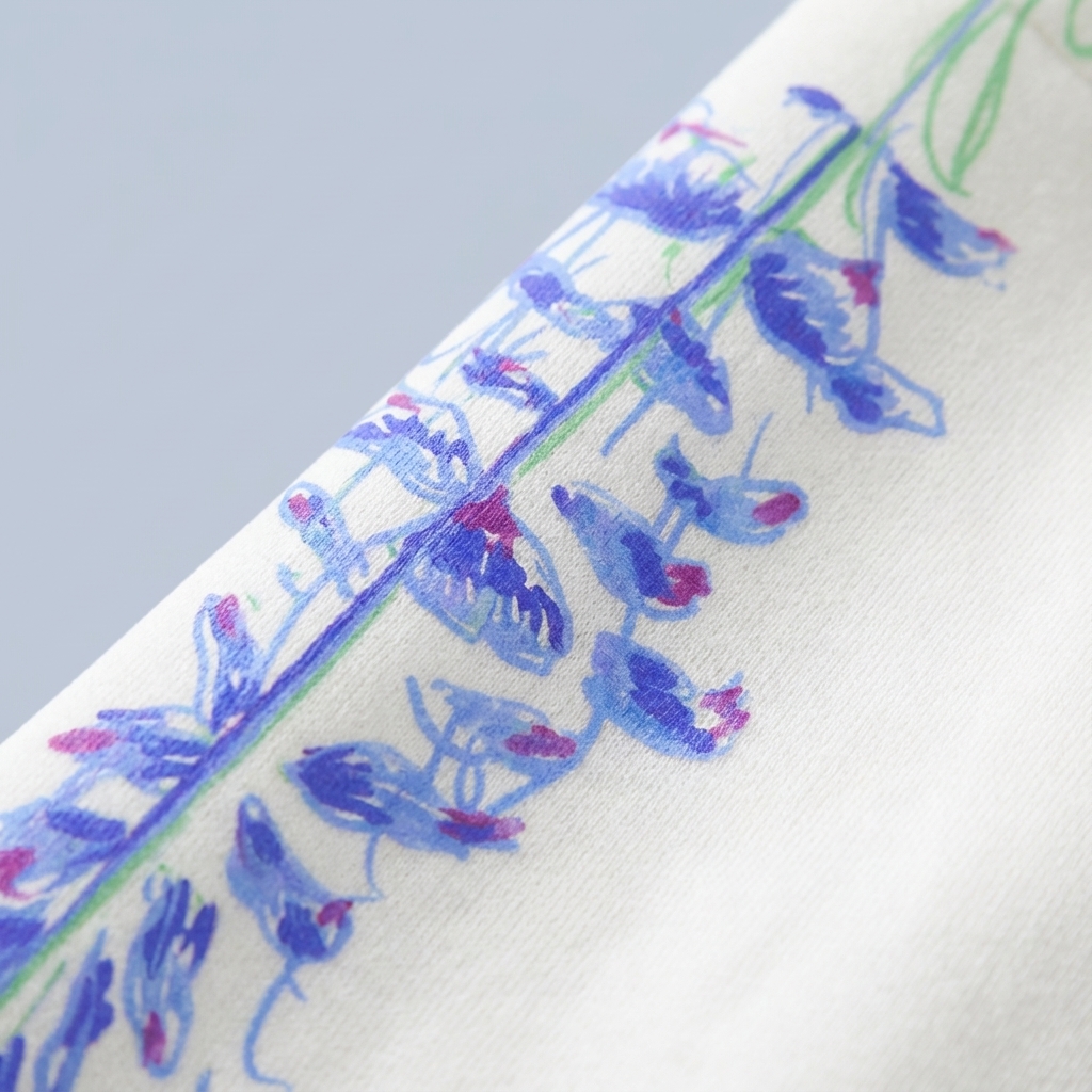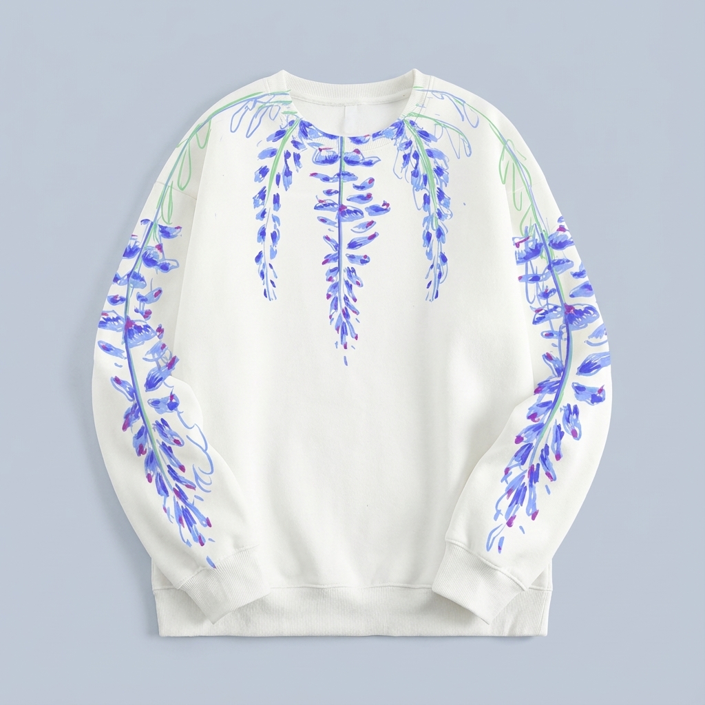 Soft white cotton sweatshirt featuring cascading blue wisteria blooms. Elegant floral artistry wraps around the shoulders for a serene, nature-inspired look.